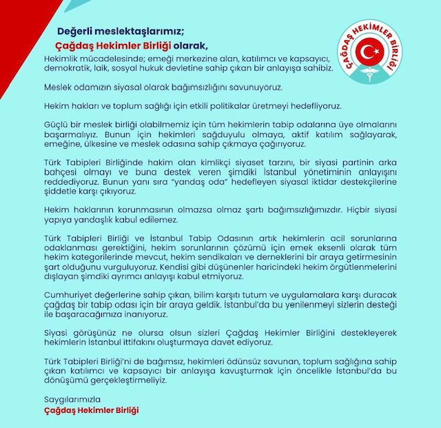 Bu olumsuz tabloyu değiştirmek ve hekimlerin sesini tüm topluma duyurabilmek için yeni bir başlangıç yaparak İstanbul'da Çağdaş Hekimler Birliğinde bir araya geldik. Şimdi hedefimiz hekim sorunlarına sahip çıkan bir temelde meslektaşlarımızın da desteğini alarak yeni bir tabip odası inşa etmek, hekimlerin tabip odasını sahiplenmesini sağlamak, üyelerimizin katılımını ve üyemiz olmayan meslektaşlarımızı da üye yaparak güçlü bir tabip odası oluşturmaktır. Hekimlere meslek odalarını geri almayı vaat ediyoruz. Üyelerimize açık ve şeffaf bir çalışma sergileyerek ve birlikte hareket ederek odamızı güçlü bir yapı haline getirmeyi amaçlıyoruz.
